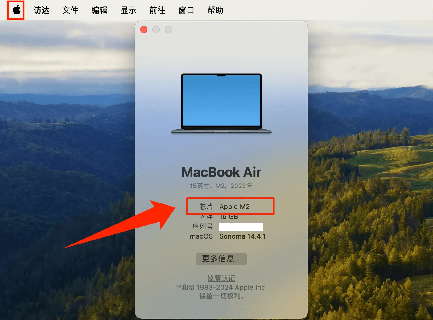 查看自己电脑属于什么芯片,可以左上角点击苹果LOGO,然后查看关于本机界面;
