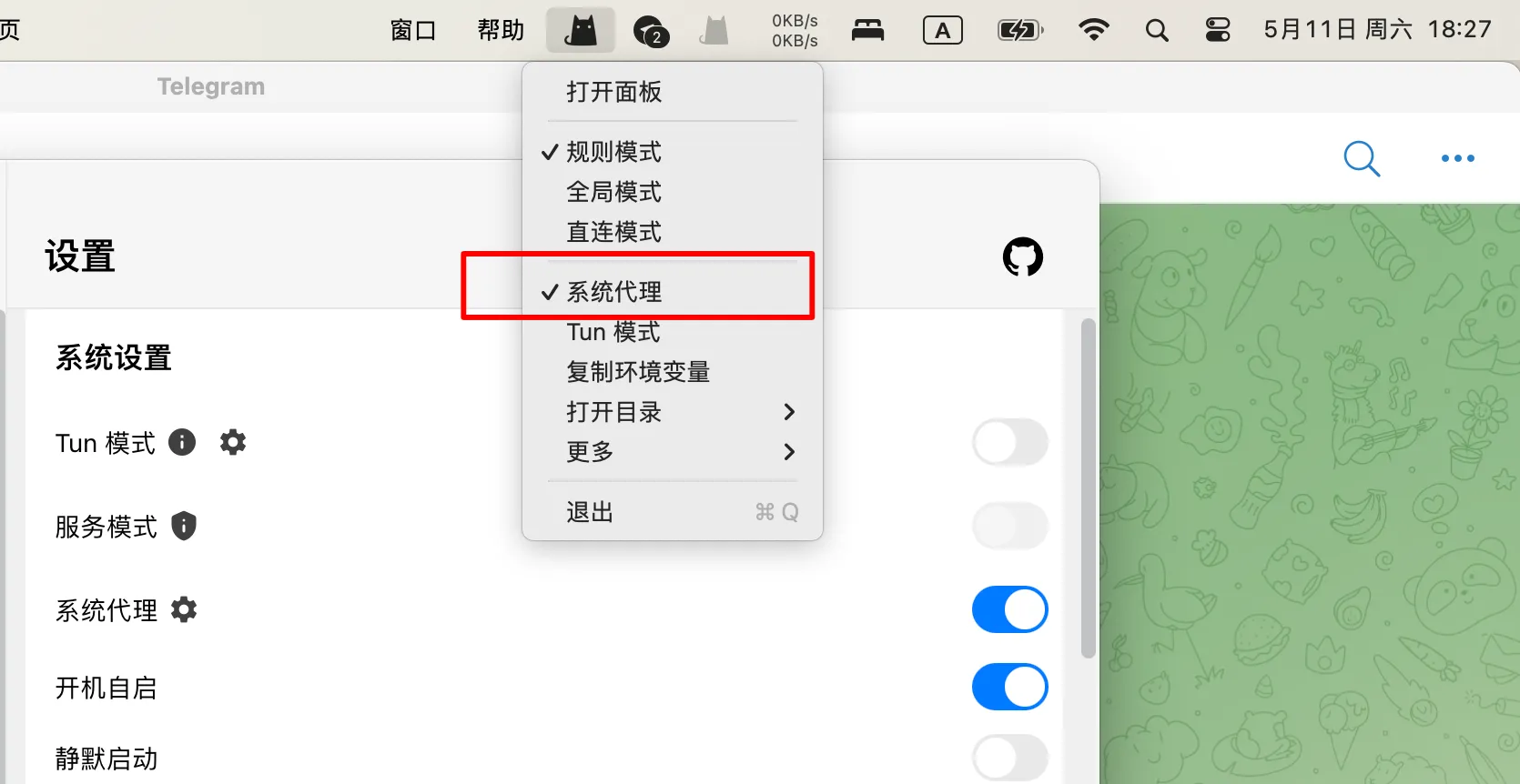 打开 Clash-Verge,点击左侧 设置 - 右侧 系统设置里面有个 系统代理 开关,这个就是 Clash Verge 的总开关,也是系统代理开关;